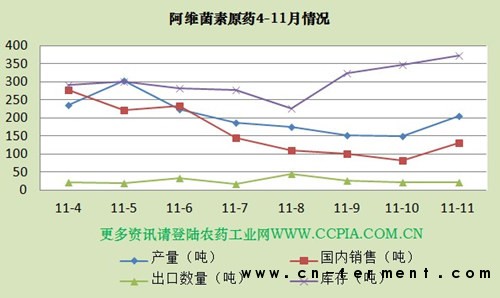 11月国内销售为130.322吨,部分制剂企业冬储量有一定上升,元旦以后基本准备第一轮铺货。若11年为暖冬,则虫口基数会增大,12年虫害相对严重机率大,近期气象部门尚未发布明确消息,暖冬、冷冬尚待进一步观察,企业也需关注气象情况,对储货量有一定的参考价值。企业直接出口数量21.384吨,基本为国内企业与跨国公司签订订单,按订单出售原药,跨国公司再配置为制剂销售,国内企业仅赚取微薄的代工费。