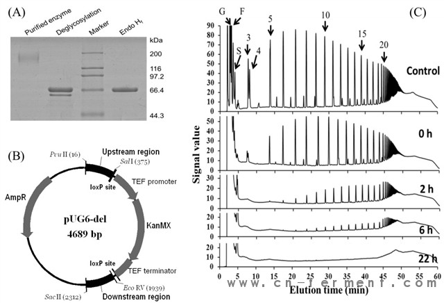 (A) 酿酒酵母菊糖水解酶的纯化;(B) 基因敲除载体;(C) 菊糖水解酶的酶解动态