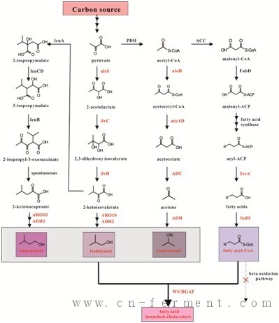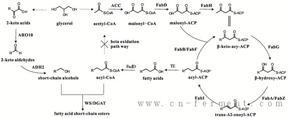 图2:在大肠杆菌中生产脂肪酸短链酯代谢途径