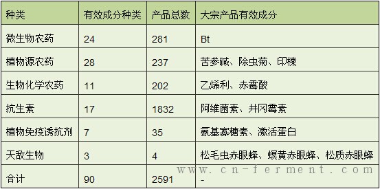 中国生物源农药登记注册情况(截止2012年12月的统计结果,包括单剂和混配药剂)