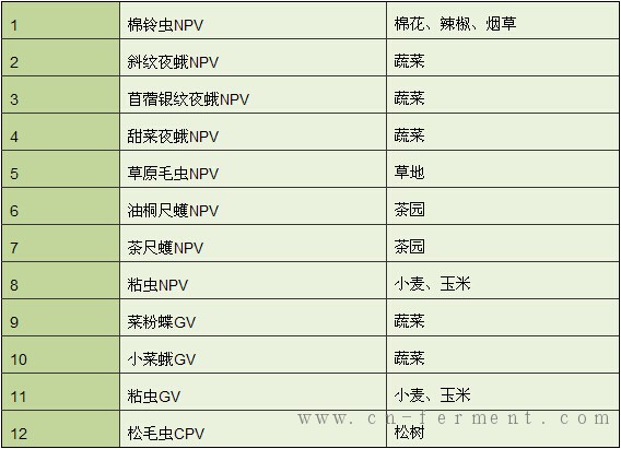 我国已登记的病毒杀虫剂(资料引自:农业部农药农药检定所,农药手册,不包括复方)