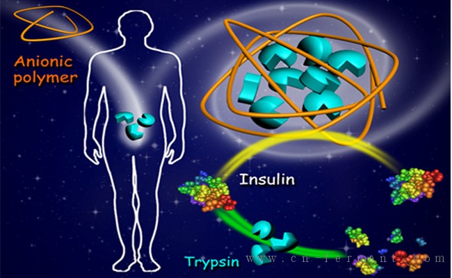 以海藻酸钠为代表的海洋生物多糖材料来源广泛、生物安全性高、可降解,并且具有抗病毒、增强机体免疫力等多种生物活性,在生物医用材料及药物传递系统领域有广泛的应用研究。科研人员在对海洋多糖材料深入研究的基础上,首次发现了海藻酸钠形成的聚合物具有抑制胰蛋白酶酶解这一新的生物学特性。该聚合物通过缠绕包裹作用束缚蛋白酶,阻止其与底物的接触,从而实现抑制酶解作用。该工作以活性蛋白药物胰岛素为模型,以海藻酸钠为蛋白酶抑制剂,体外酶解实验表明该抑制剂可有效阻止胰蛋白酶对口服药物的酶解,其抑酶效率约为现有同类商品的400倍,是理想的蛋白及多肽类活性药物的功能性载体,为解决蛋白与多肽类药物口服提供了新的策略,在生物医药领域具有广阔的应用前景。