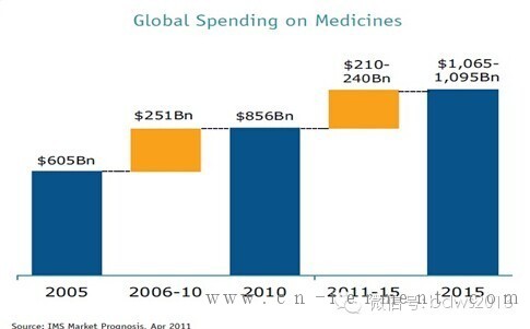 到2015年,全球医药指出将达到1.1万亿美元,对比与过去五年的6.2%的年增长率,预计未来五年的年增长率将下降到3-6%。全球总支出增长额预计将在2005年增长的2510亿美元的基础上增长2100-2400亿美元。