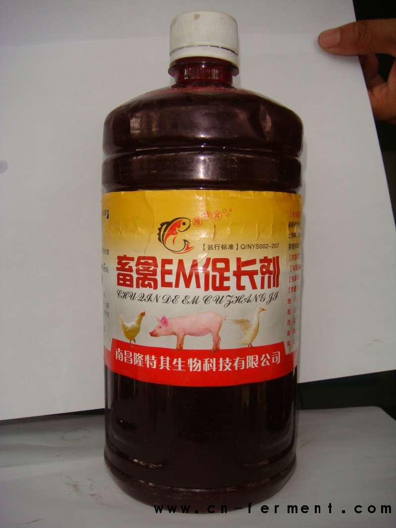 3、拌合饲喂:按饲料量的0.3%~0.5%添加畜/禽专用促长剂及等量红糖加入饲料搅拌。如:100斤饲料加入150ml~250ml畜/禽专用促长剂和等量红糖,将菌剂和红糖加入一定量的水溶解并搅拌均匀(水温不能超过40℃),然后均匀喷洒在混合饲料上,用塑料布盖严放置3—24个小时再饲喂。