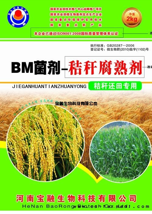 宝融牌秸秆腐熟剂由能够强烈分解纤维素、半纤维素、木质素的嗜热、耐热细菌、真菌、放线菌和生物酶组成。在适宜的条件下,能迅速将秸秆堆料中的碳、氮、磷、钾、硫等分解矿化,形成简单有机物,从而进一步分解为作物可吸收的营养成分。同时,消除了秸秆堆料中的病虫害、杂草种子等有害物质。本品无污染,其中所含的一些功能微生物兼有生物菌肥的作用,对作物生长十分有利。一、功能与特点 1、适用对象:干、鲜玉米秸秆、麦秆、稻秆、谷秆、红薯藤、蚕豆秸、油菜秆、杂草、树叶、纤维物质含量高的生活垃圾等。 2、适用范围:农户堆肥、制作育苗基质、有机肥厂秸秆等辅料的前期处理。 3、与传统秸秆堆肥相比,使用秸秆腐熟剂堆肥时间短,不受季节限制,劳动强度低,堆肥肥力高,成本低,容易操作。 4、腐熟快。0℃以上时3天后堆温即可达到50-60℃。通常情况下,秸秆15-20天即可腐熟,变成褐色或黑褐色。 5、杀灭病虫。堆肥过程中的堆温较高,能杀灭秸秆中的病菌、虫卵及杂草种子,减轻病虫草害及污染。秸秆腐熟剂中的高效有益微生物,能在堆制过程中和施入土壤后大量繁殖,抑制杀灭土壤中的致病真菌,减轻作物病害。 6、肥分高。使用宝融牌秸秆腐熟剂生产的秸秆堆肥能增加土壤中的有机质含量,改善土壤营养状况,提高化肥的利用率。增强作物的抗病能力,促进氮、磷、钾及微量元素的吸收,刺激作物快速生长。二、使用方法 1、将秸秆用粉碎机粉碎或用铡草机切断,长度小于3-5厘米为宜(麦秸、稻草、树叶、杂草、花生秧、豆秸等可直接用于发酵,但粉碎后发酵效果更佳)。 2、把粉碎或切断后的秸秆用水浇湿、渗透,浇水时加入2~5%的磷酸二铵(以秸秆干重计,不同材料加入量不同)与秸秆混合均匀,秸秆含水量掌握在60—70%左右。也可用10~15%的粪便代替磷酸二铵。 3、按1:2000的比例将宝融牌秸秆腐熟剂加入秸秆中,采用逐级混合法(先将500克BM秸秆腐熟剂与5千克玉米面、麸皮、统糠、油枯等其中任意一种混合均匀,再与秸秆堆料混合)。 4、起堆,用塑料薄膜封严,以防止水分蒸发、堆温扩散和养分损失 。 三、注意事项 1、勿与杀菌农药混用。 2、置于阴凉、干燥处保存。应用我公司菌剂,可享受以下免费服务:(1)免费提供作物施肥技术咨询服务;(2)免费提供作物有机-无机专用肥配方技术; (3)免费提供有机肥厂、复混肥厂的设计规划方案和预算;(4)免费提供可信赖的有机肥设备生产厂家,为客户购买设备提供有效参考意见;(5)免费提供有机肥、生物有机肥发酵技术和生产技术。