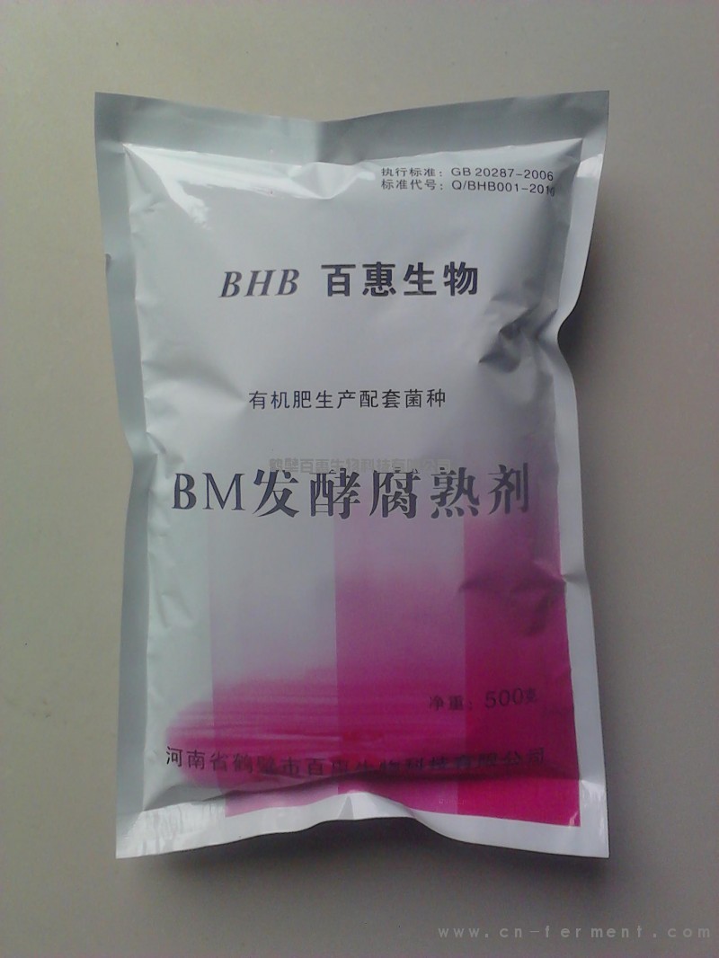 BM有机肥发酵腐熟剂是由具有强烈分解、腐熟、转化功能的真菌、细菌、放线菌中的多种菌株及相关酶类复配而制成。其作用机理是:通过微生物的生长、繁殖产生热量,促使生化污泥、畜禽粪便、糟渣类物质等有机物料充分转化,将碳、氮、磷、钾、硫等分解矿化,将大分子转化为作物容易利用的小分子或者腐殖质,同时达到升温、除臭、消除病原微生物、虫卵、杂草种子和增加速效养分的效果。