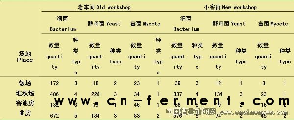 宣酒芝麻香型白酒的生产主要在老车间与小窖群(新车间)两大车间进行,分别以两车间的饭场、堆积产、窖池房和曲房为空气微生物采集场地,对三大类微生物分离计数。