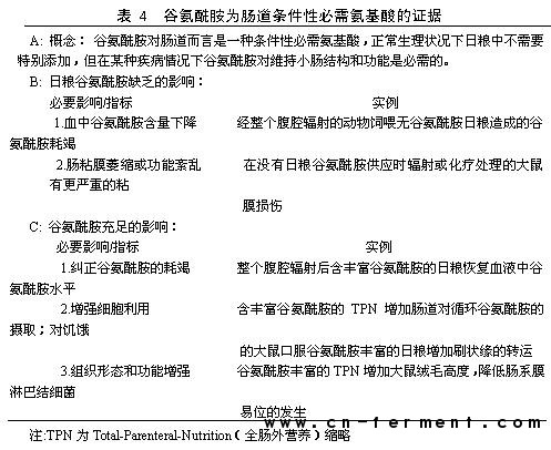 谷氨酰胺通常被归类为非必需氨基酸,这表明谷氨酰胺可以被足量的合成。又因为谷氨酰胺与其它氨基酸相比其不稳定和不易保存,故在胃、肠外营养支持液中不被利用。而此种谷氨酰胺为非必需氨基酸的观点低估了其在代谢中质量和数量上的重要性。最近研究表明,在一些重要疾病中谷氨酰胺可能是一种条件性必需氨基酸,特别是关于其支持小肠粘膜代谢的需要。总之,许多研究表明谷氨酰胺在健康状态下是非必需的,但在如饥饿、化疗、辐射疗法导致的小肠粘膜受损或谷氨酰胺耗竭严重的情况下其是必需的。TPN中增加谷氨酰胺或口服谷氨酰胺,均可有效地减轻肠道粘膜萎缩、增强小肠和结肠细胞的活性、增强肠粘膜功能、减少肠道内细菌和内毒素易位。谷氨酰胺减轻肠粘膜结构损伤和改善肠粘膜屏障功能的机制尚不很清楚,可能有:
