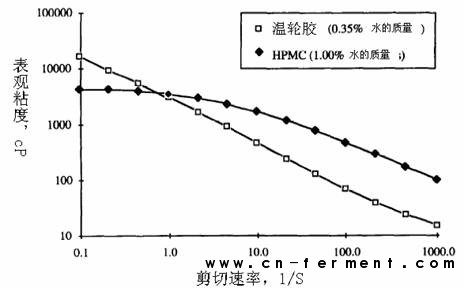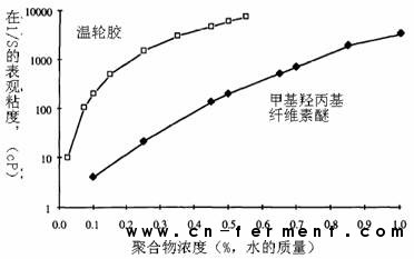 图3-2比较了20。C下0.01mol/L 氯化钠水溶液分别含有温轮胶和HPMC(甲基羟丙基纤维素醚)在较低的剪切速率0.1s-1下的表观粘度。
