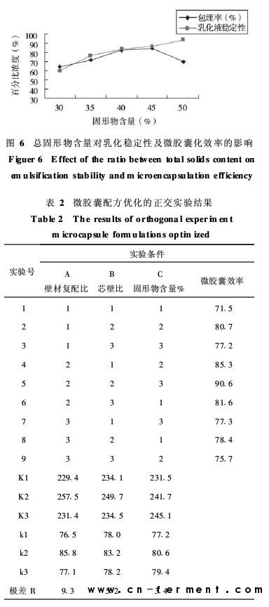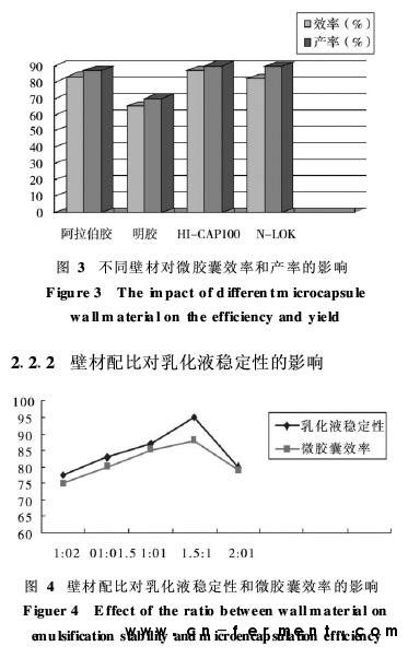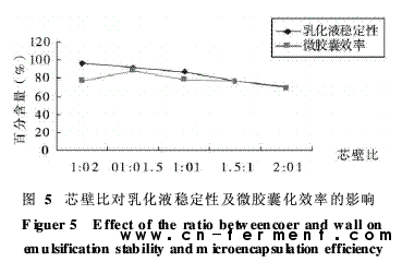 为了提高微胶囊芯材的含量,往往通过提高芯材和壁材的比例来实现。但是也要考虑芯壁比对乳化液稳定性和微胶囊的包埋效率的影响。