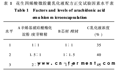 (1) HI-CAP-100作为ARA喷雾干燥微胶囊化壁材,在高载量下具有良好的乳化性和稳定性,微胶囊产品颗粒均匀、干燥,粘壁少。采用正交实验进行参数优化,得到制备花生四烯酸微胶囊的乳化液优化配方为: HI-CAP100与麦芽糊精的配比1·5∶1,心材与壁材比率1∶1·5,乳化液浓度40% (W /V);