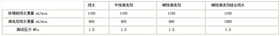 由于废水的 COD 含量非常高 , 随着浓缩过程的进行 , 浓缩液的 COD 含量越来越高 , 与之对应透过液的流量也越来越小 , 直到流量小到无法浓缩为止。这时就需要进行清洗,恢复纳滤膜的纯水通量,恢复情况的好坏,直接关系到纳滤膜的使用寿命,关系到大观霉素废水处理的经济性。我们用纯水、中性清洗剂、碱性清洗剂和碱性清洗剂结合纯水清洗来比较不同清洗剂对纳滤膜的纯水通量的影响。