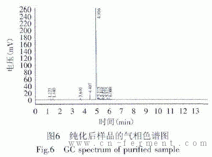 从发酵液中提取丙酸的方法很多,如溶剂萃取法、超滤膜法、蒸馏法、电渗析法等[11]。同上述方法相比较,离子交换法具有一定的优越性:a.细胞毒性小,有利于丙酸发酵与提取的耦合[12];b.离子交换树脂可重复使用,生产成本较低。鉴此,本实验采取离子交换法进行丙酸的分离提纯。按1.2.6中的方法从发酵液中提取丙酸,纯度可达98%以上,纯化后的样品经气相色谱法检测,结果见图6。