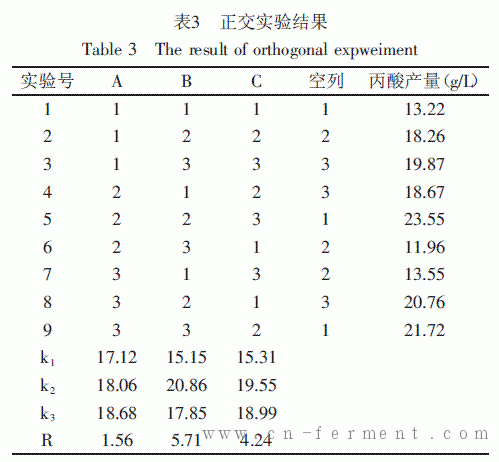 正交实验结果见表3,决定丙酸产量的影响因子顺序为:培养温度(B)>接种比例(C)>发酵时间(A);产丙酸条件的最优因子组合为A3B2C2,即发酵时间为180h,培养温度为30℃,接种比例为Pa∶Sc=2.5∶1。