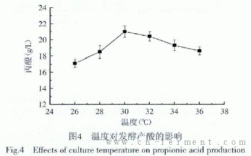 微生物的生长和产物的合成都是在各种酶的催化下完成的,而温度是保证各种酶生物催化活性的重要因素。因此,在发酵过程中,保持相对稳定而又适宜的温度是非常必要的。温度对发酵的影响主要表现在对菌体生长的影响和产物合成的影响[2,9]。从图4可知,当发酵温度为30℃时混菌发酵产丙酸水平最高,达21.01g/L。温度大于32℃后产酸水平下降,说明温度过高不利于产物累积;另一方面,产酸丙酸杆菌的最适生长温度为28~30℃。因此,从菌体最适生长和产物最大累积综合考虑,确定最佳发酵温度为30℃。