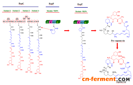雷帕霉素的生物合成途径为,雷帕霉素由七个单位的乙酸盐七个单位的丙酸盐通过聚酮途径合成,所需的甲基来自甲硫氨酸。起始单元是莽草酸经还原以后的产物,从莽草酸形成环己乙烷衍生物的过程保留了环己烷基的完整性。赖氨酸先脱氨环化形成羧酸哌啶,再由羧酸哌啶和聚酮乙酯健和酰胺键连接,形成雷帕霉素的初始结构。