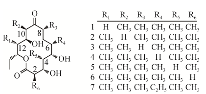 | 图4 延伸模块AT功能域替换所产生的新型红霉内酯1-7[38, 39, 40, 41, 42]Fig.4 Novelerythronolides 1-7 produced by substituting the AT domains in the extender modules[38, 39, 40, 41,42] |