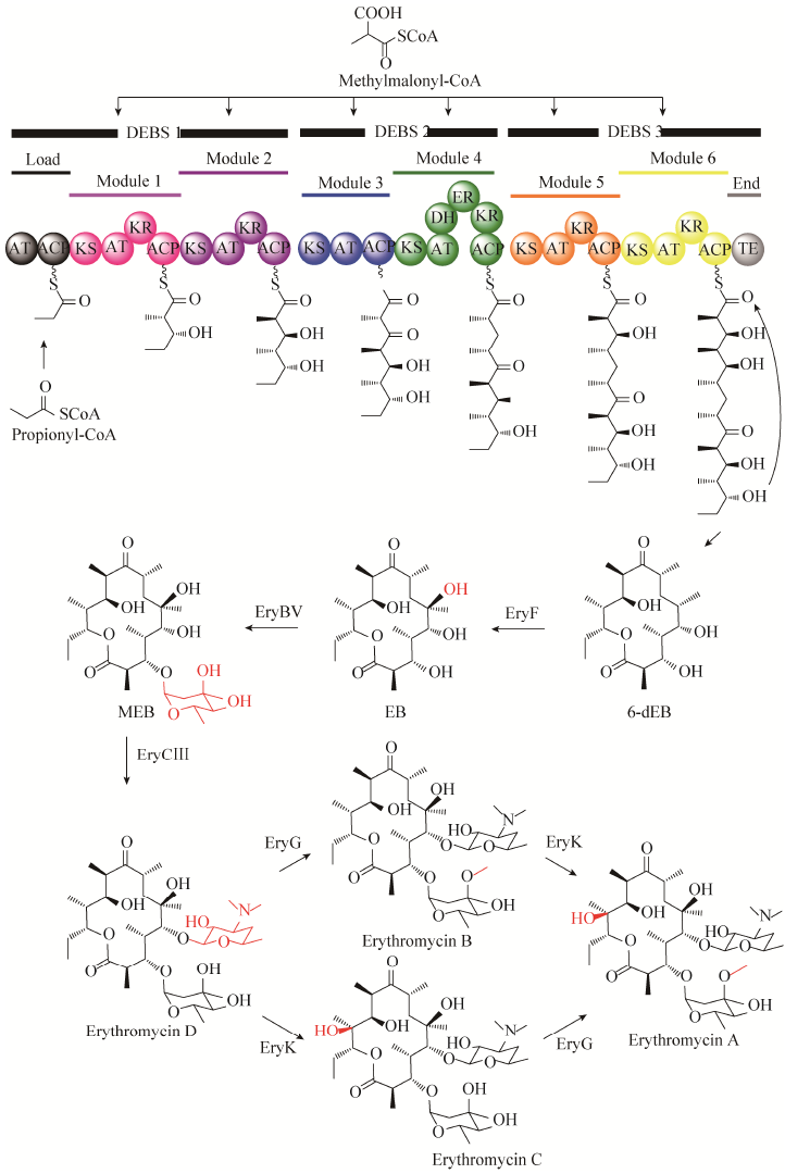1 红霉素A的生物合成机制红霉素A的生物合成可以分为大环内酯骨架6-脱氧红霉内酯B (6-deoxyerythronolide B,6-dEB) 的形成和后修饰两大步骤[23]。