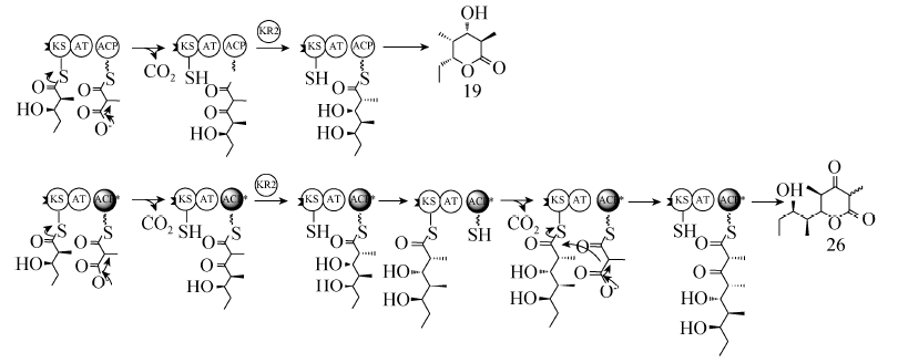 近年来对DEBS的蛋白晶体学研究日益深入,基于对蛋白立体结构和蛋白亚基相互作用的分析,可以人为地对PKS模块进行定向改造。研究发现,ACP功能域的结构对延伸中的聚酮链在模块内和模块间的传递都至关重要[61]。通过改造红霉素PKS模块3中的ACP,将其部分替换成模块2的ACP,可以实现整个模块3的重复使用,形成四酮产物26[62] (图9)。