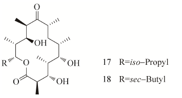 | 图7 起始模块替换所产生的新型红霉内酯17-18[52]Fig.7 Novel erythronolides 17-18 produced by substituting the loading module[52] |