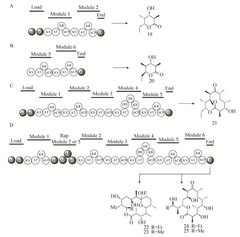 | 图8 重组模块的结构与其催化合成的产物[54, 55, 59, 60] (A:TE功能域与起始模块、延伸模块1-2组合所产生的新型六元内酯19;B:TE功能域与延伸模块5-6组合所产生的新型六元内酯20;C:TE功能域与起始模块、延伸模块1-5组合所产生的新型十二元内酯21;D:雷帕霉素延伸模块2或5插入所产生的新型十六元内酯22和23、新型十四元内酯24和25)Fig.8 Domain organization of hybrid PKSs and their products[54, 55, 59, 60]. (A) A novel six-membered erythronolide 19 produced by coupling the TE domain with the loading module and the extender modules 1-2. (B) A novel six-membered erythronolide 20 produced by coupling the TE domain with the loading module and the extender modules 5-6. (C) A novel twelve-membered erythronolide 21 produced by coupling the TE domain with the loading module and the extender modules 1-5. (D) Novel sixteen-membered erythronolides 22 and 23 and fourteen-membered erythronolides 24 and 25 produced by inserting the extender module 2 or 5 of rapamycin |