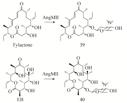 许多糖基转移酶对底物的容忍性都比较高,可能将不同的糖基转移至红霉素大环内酯骨架。例如,来自泛温链霉菌Streptomyces eurythermus的AngMⅡ是泰乐菌素生物合成中糖基转移酶。以泰乐酮 (Tylactone) 作为天然底物,将D-麦氨糖转移到C5位的羟基上,产生化合物39。研究发现,AngMⅡ同样能够识别EB 作为底物,糖基化产生化合物40[69],并且糖基化的位置是C5位的羟基,而不是C3位的羟基。又如,苦霉素生物合成中负责C5位羟基糖基化的糖基转移酶对底物的容忍性也较高,能够识别一系列6-dEB类似物,可以合成超过20种以上的新化合物[70]。