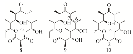 | 图5 延伸模块KR和ER功能域失活所产生的新型红霉内酯8-10[37, 43, 44]Fig.5 Novel erythronolides 8-10 produced by inactivating the KR and ER domains in the extender modules[37, 43, 44] |