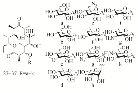 单元的结构改造着眼点应该放在由糖基转移酶EryBV催化红霉素内酯环C3位羟基的糖基化上。体外测活实验证实,EryBV对糖基单元具有比较宽泛的底物选择性,能够识别一系列的糖基作为底物以较低的催化效率合成红霉素类似物27-37[66]。