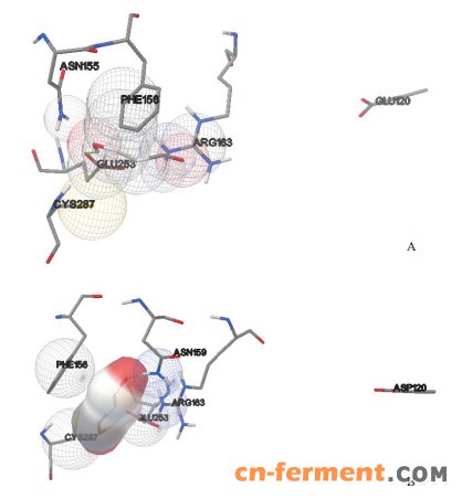 | 图 7 3-HPA与原始(A)和突变KGSADH(B)活性中心分子对接 |