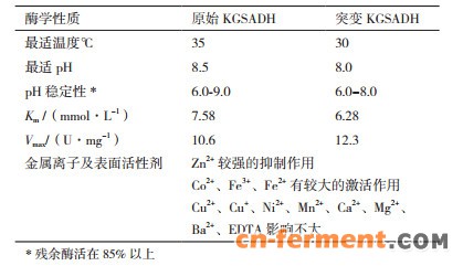 由于KGSADH具有金属离子中心,因此部分金属离子和表面活性剂会对KGSADH的酶活与催化能力产生一定的影响。实验考察了金属离子Cu2+、Cu+、Co2+、Ni2+、Mn2+、Ca2+、Mg2+、Ba2+、Zn2+、Fe3+、Fe2+和表面活性剂EDTA对KGSADH酶活的影响。从表 2中可以看出,突变前后金属离子对KGSADH酶活的影响变化不大。Zn2+对KGSADH的酶活有较强的抑制作用,而Co2+、Fe3+、Fe2+对KGSADH的酶活有较大的激活作用。在酶的动力学方面,KGSADH对乙醛的Km为7.58 mmol/L,Vmax为10.6 U/mg。突变KGSADH对乙醛的Km为6.28 mmol/L,Vmax为12.3 U/mg。突变后KGSADH的Km值降低且Vmax有所升高,说明突变后酶对底物的亲和力增加。