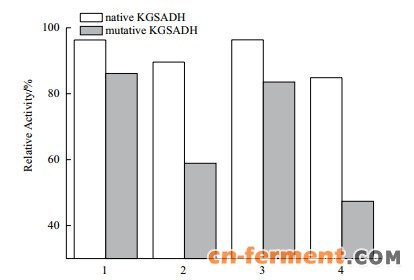 | 图 4 原始和突变KGSADH的热稳定性1:40℃保温3 h;2:40℃保温7 h;3:50℃保温3 h;4:50℃保温7 h |