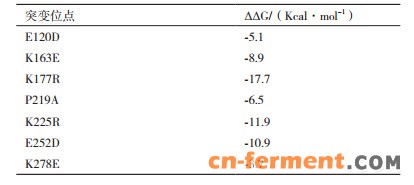 TU-KGSADH的最适温度由35℃降低为30℃,热稳定性降低,而酶的热稳定性与盐桥的形成、二硫键的引入、脯氨酸的含量及芳香族氨基酸的相互作用等因素有关[14]。据统计,耐热性的蛋白中脯氨酸的含量比耐中温蛋白高40%-50%,而嗜冷蛋白中脯氨酸的含量明显低于耐中温蛋白[15],尤其脯氨酸残基位于α-helix的第一位和β-turn的第2位上时,脯氨酸残基的刚性结构对蛋白质的热稳定性有较大的贡献[16]。将KGSADH α-helix结构中219位脯氨酸突变为丙氨酸,破坏了脯氨酸残基的刚性结构,这可能是突变酶最适温度和热稳定性降低的原因。