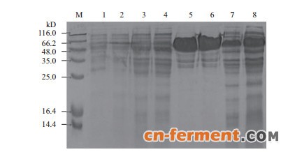| 图 3 ZJB12043和ZJB15026的表达与纯化的SDS-PAGE分析M:蛋白Marker;1:E. coli BL21;2:E. coli BL21/pET-28b;3:未诱导ZJB12043;4:未诱导的ZJB15026;5:ZJB12043纯酶;6:ZJB15026纯酶;7:ZJB12043粗酶液;8:ZJB15026粗酶液 |