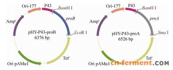 利用引物proBB-FW & proBE-RV从枯草芽孢杆菌WB600基因组上将编码谷氨酸激酶的proB基因克隆出来,连接到经相同酶切的pHY-P43载体上,构建质粒pHY-P43-proB。利用类似方法构建了重组质粒pHY-P43-proA。