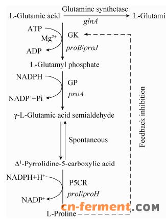 | 图 1 枯草芽孢杆菌L-脯氨酸生物合成途径Figure 1 Biosynthetic pathway of L-proline in Bacillus subtilis. |