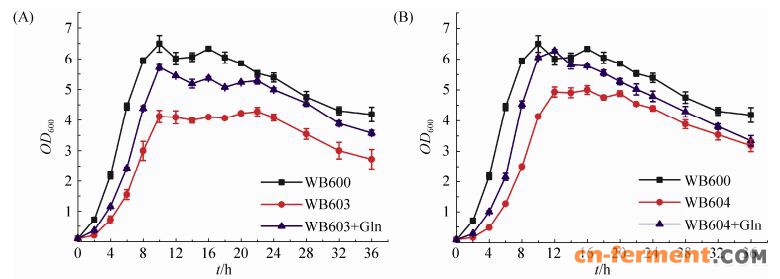 | 图 4 重组菌WB603和WB604生长曲线Figure 4 Growth curves of recombinant strains WB603 and WB604. +Gln means initial LB medium contained 5 mmol/L glutamine. |