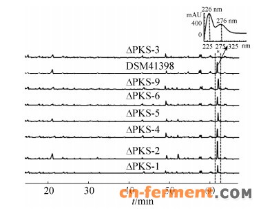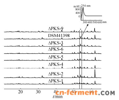 | 图 2 野生型菌株和突变株次生代谢产物的HPLC分析(λ=254 nm)及目标峰的特征吸收谱Figure 2 HPLC analysis (λ=254 nm) of the secondary metabolites of wild type and mutant strains, together with the UV spectrum of the target compound. Wild type strain: S. albus DSM 41398; mutant strains: △PKS-1, △PKS-2, △PKS-3, △PKS-4, △PKS-5, △PKS-6 and △PKS-9. |