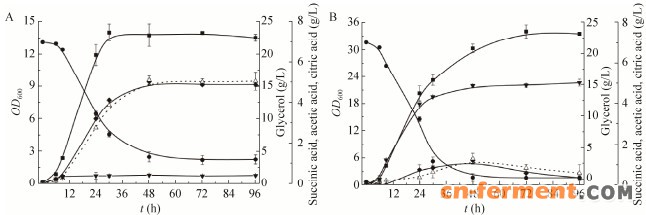 | 图 2 解脂酵母PGC01003 (A)和Po1f (B)的琥珀酸发酵比较Figure 2 Fermentation profiles of PGC01003 (A) and Po1f (B) in YPG flasks. Squares stand for OD600, circles stand for glycerol concentrations, diomands stand for succinic acid concentrations, upright triangles stand for acetic acid concentrations and inverted triangles stand for citric acid concentrations. |