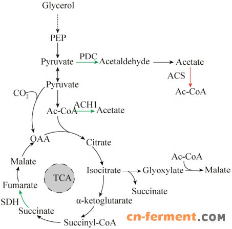 解脂耶氏酵母Yarrowia lipolytica是非传统酵母,严格好氧,利用完整的TCA循环和电子传递链维持生长[12-13]。它能积累大量的有机酸,包括柠檬酸、异柠檬酸、α-酮戊二酸等[14-16]。经过代谢工程改造后,敲除琥珀酸脱氢酶(Succinate dehydrogenase,SDH)的编码基因或者弱化该基因的启动子,Y. lipolytica可积累琥珀酸[17-18]。2010年Gao等通过敲除Sdh2亚基成功构建可积累4.0 g/L琥珀酸的Y. lipolytica重组菌,随后采用化学诱变的方法获得琥珀酸产量进一步提高的突变株。我们课题组通过基因敲除Y. lipolytica Po1f的SDH的Sdh5亚基获得了重组菌PGC01003[19]。PGC01003在不控制pH值的中性环境下以甘油作碳源发酵足够长时间能生产琥珀酸,这充分证明了该菌株的鲁棒性。然而,实验存在一些亟待解决的问题。重组菌在发酵产生琥珀酸的同时,由于代谢溢出,还产生较多的副产物乙酸。乙酸对菌体具有毒害作用,抑制细胞生长和琥珀酸发酵。如果不控制发酵液的pH值,琥珀酸的产量很低[19]。
