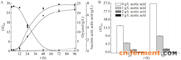 | 图 4 PGC11505琥珀酸发酵分析(A)与乙酸耐受实验(B)Figure 4 Succinic acid fermentation profiles of PGC11505 (A) and effect of exogenous acetic acid on cell growth of PGC11505 (B). (A) Squares stand for OD600; circles stand for glycerol concentrations; diamonds stand for succinic acid concentrations and upright triangles stand for acetic acid concentrations. |