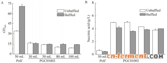 | 图 3 PGC01003在不带/带挡板的摇瓶以及不同装液量条件下菌体OD值(A)和琥珀酸产量分析(B)Figure 3 OD (A) and succinic acid fermentation (B) of PGC01003 in flasks without/with baffles and with varied volumes of fermentation broth. |