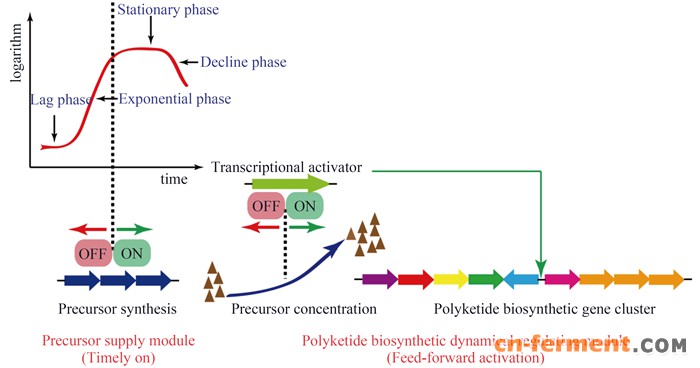 链霉菌生长具有复杂的形态和发育分化周期,以及从初级代谢到次级代谢的转折,而聚酮化合物都是次级代谢的产物,因此聚酮在链霉菌完成初级生长后才启动合成。这一合成时序对聚酮产生菌具有重要的生物学意义:聚酮作为抗生素,其靶点一般为重要生命过程的关键环节,如细胞壁合成、RNA转录,蛋白质翻译等,如果在菌体生长对数期或更早的生长时期开启合成,势必对菌体生长造成不利的影响;另外,聚酮作为次级代谢产物,不为菌体生长所必须。所以,在实际生产过程中,应该充分利用聚酮在稳定期开始大量合成这一自然进化特征,而不是人为的通过简单过表达相关基因来提前启动聚酮生物合成。因此,我们希望今后在链霉菌工程改造中,借助合成生物学策略,通过在链霉菌中加载人工设计的控制元件,对聚酮化合物生物合成途径关键节点进行智能调控,实现关键基因“适时”、“适量”表达,来显著提高链霉菌中聚酮化合物生物合成能力。例如图 2所示,构建一个通过感应细胞生长来开启前体供应的调控模块,当链霉菌生长到稳定期时开启聚酮前体合成和供应;同时构建聚酮合成动态感应调控系统,可以根据前体浓度来微调合成途径中特异性激活蛋白表达,从而调节聚酮合成基因簇表达,实现聚酮生物合成智能动态控制,提高聚酮合成产量。我们相信,通过设计和开发智能人工控制系统,可以在链霉菌中大幅提高聚酮生物合成能力,为聚酮化合物工业生产提供最优的解决方案。