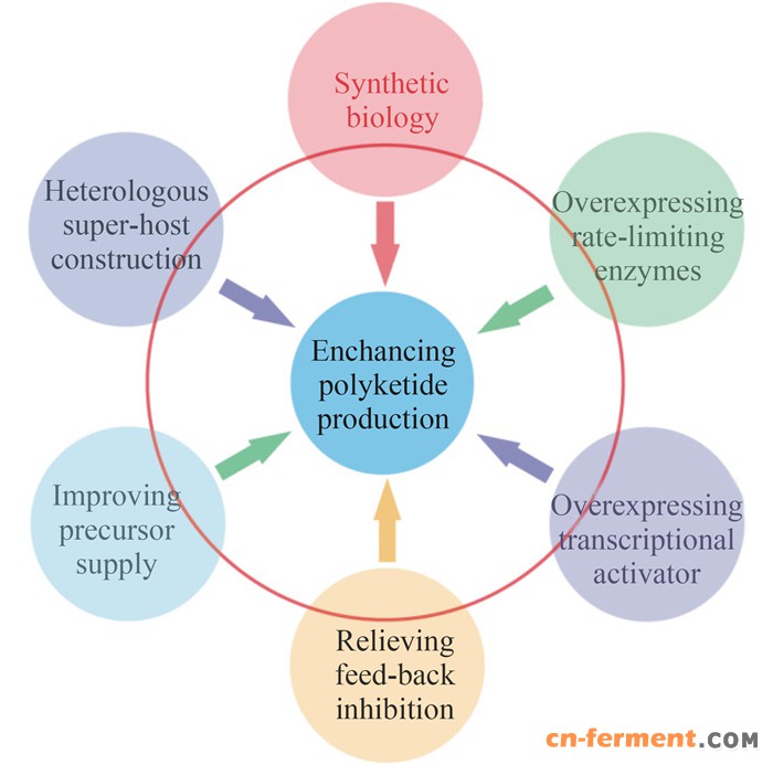 | 图 1. 链霉菌聚酮合成高效生产方法 Figure 1. Strategies to improve polyketide production in Streptomyces host. |