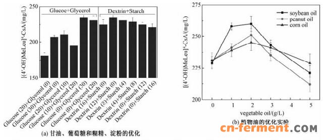 在30.0 g/L甘油基础上,比较淀粉和糊精的添加量对[(4'-OH)MeLeu]4-CsA产量的影响。结果表明,无论是混合添加还是单独添加淀粉和糊精,[(4'-OH)MeLeu]4-CsA的产量都维持在221~235 mg/L之间,产量变化不大(图 3(a)),推测糊精和淀粉在本实验条件下可以相互替换。因而,在后续的实验中,仍然单独采用12 g/L糊精作为迟效碳源,在30.0 g/L甘油和12.0 g/L糊精作为碳源的条件下,[(4'-OH)MeLeu]4-CsA的产量达到235 mg/L。