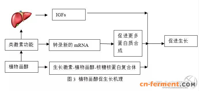 对于植物甾醇促进动物生长的作用,早在10多年前就有研究报道了。综合前人的报道和笔者多年的经验,我们认为最少有以下三种途径或者机理来阐明植物甾醇促生长作用(见图3)。第一条途径是植物甾醇在水溶质的状态下,生长激素、植物甾醇、核糖核蛋白体三者形成复合体,这种复合体的结构相对单独存在的生长激素较为稳定,从而延长生长激素的半衰期,发挥了稳定生长激素结构的作用,延长生长激素作用的时间,从而促进动物生长。第二条途径是植物甾醇是类固醇激素的前体物质,具有类激素功能,能与靶细胞受体结合,激发DNA的转录活动,生成新的mRNA,诱导蛋白质的合成。第三条途径是植物甾醇在肝脏,刺激产生类胰岛素生长因子,激活生长轴,促进生长。