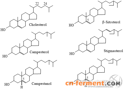 甾醇是广泛存在于生物体内的一种重要的天然活性物质,按其来源分为动物性甾醇,植物性甾醇和菌类甾醇三大类。动物性甾醇以胆固醇为主;植物甾醇是存在植物细胞膜上的重要物质,以谷甾醇为主;菌类甾醇主要为麦角甾醇。