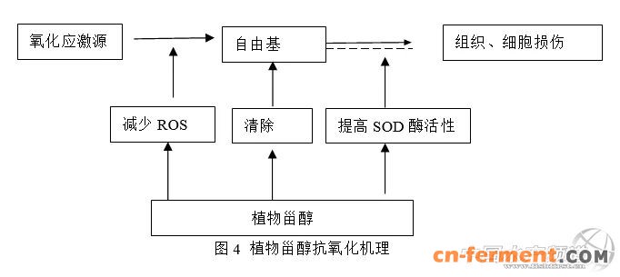 植物甾醇特有的亚乙基基团有特殊的抗氧化生理功能,能在29-烯丙基处快速形成一个自由基,此自由基即异构化为一个叔自由基,该叔自由基比脂肪酸碳中心自由基更稳定,从而阻断了脂肪酸的氧化反应。结合文献和笔者多年从业经验,植物甾醇最少有三条途径发挥其抗氧化功能,第一条途径,直接减少ROS的产生;第二条途径,直接清除自由基;第三条途径,提高SOD等酶的活性,从而达到减缓或者消除氧化应激对组织细胞的损伤,见图4。