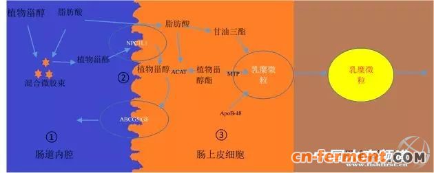 研究表明,植物甾醇的吸收过程可分为图6的3个阶段:(1)植物甾醇在肠腔内与胆汁酸、游离脂肪酸等形成混合胶束;(2)混合胶束接近上皮细胞,植物甾醇从胶束中游离出来,被细胞膜上的相关转运载体吸收进入细胞;(3)进入细胞内的甾醇在细胞内ACAT酶(胆固醇酰基转移酶)的作用下被酯化,然后在MTP(甘油三酯转运蛋白)的作用下与甘油三酯、载脂蛋白形成乳糜,分泌进入血液循环系统。