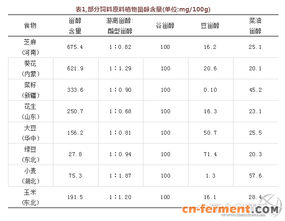 植物甾醇存在于所有植物性食物中,部分饲料原料里植物甾醇的含量见表1(蔚莱生物,2015)。
