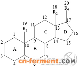 由四个相并的环(图中A、B、C、D)组成基本骨架以及三个侧链(R1、R2、R3)构成环戊烷并氢菲的结构。R1和R2一般为甲基,R3可以由2-10个碳原子组成,C3上一般带有一个羟基。